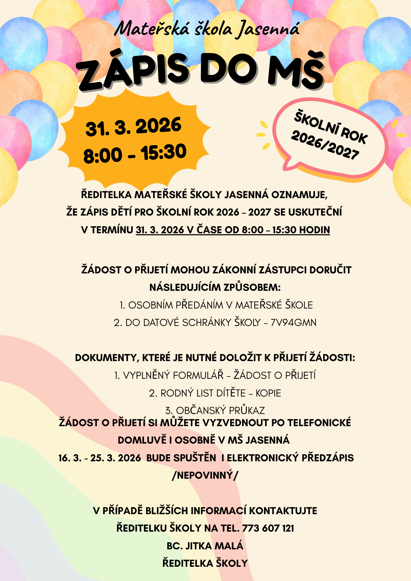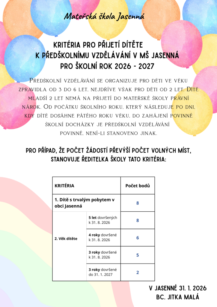 ŘEDITELKA MATEŘSKÉ ŠKOLY JASENNÁ OZNAMUJE, ŽE ZÁPIS DĚTÍ PRO ŠKOLNÍ ROK 2026 – 2027 SE USKUTEČNÍ V TERMÍNU 31. 3. 2026 V ČASE OD 8:00 – 15:30 HODIN.